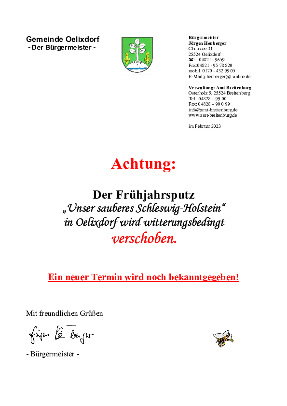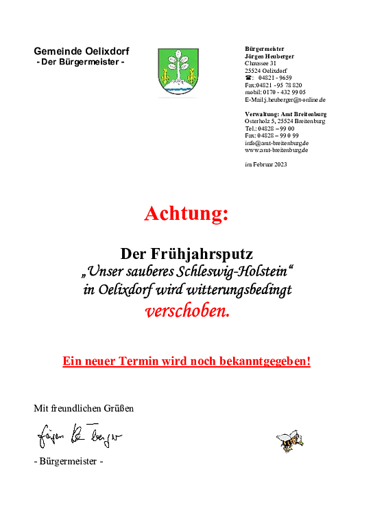 Witterungsbedingt wird die Aktion "Sauberes Schleswig-Holstein" in Oelixdorf verschoben. Ein neuer Termin steht noch nicht fest.